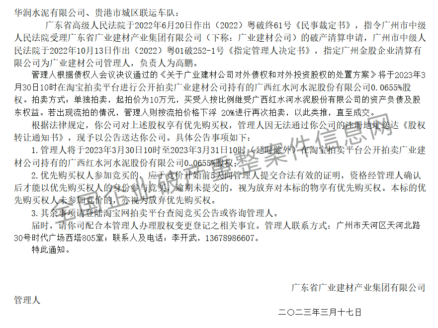 3月17日廣東省廣業(yè)建材產(chǎn)業(yè)集團(tuán)有限公司管理人發(fā)布通知給華潤水泥有限公司、貴港市城區(qū)聯(lián)運(yùn)車隊(duì)稱,廣東省高級人民法院于2022年10月13日指定廣州金股企業(yè)清算有限公司為廣業(yè)建材公司管理人。管理人根據(jù)債權(quán)人會議決議于2023年3月30日10時在淘寶拍賣平臺進(jìn)行公開拍賣廣業(yè)建材公司持有的廣西紅水河水泥股份有限公司0.0655%股權(quán)。