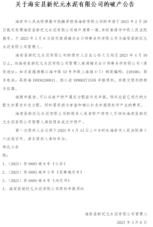 3月6日海安縣新紀(jì)元水泥有限公司管理人發(fā)布公告稱,海安市人民法院根據(jù)中投融資擔(dān)保海安有限公司的申請于2023年2月28日裁定受理海安縣新紀(jì)元水泥有限公司破產(chǎn)清算一案,并指定管理人。
