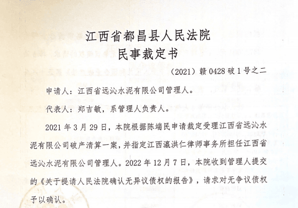 2月27日,江西省都昌縣人民法院民事裁定書提到,2021年3月29日,法院根據(jù)陳端民申請裁定受理江西省遠(yuǎn)沁水泥有限公司破產(chǎn)清算一案,并指定江西流洪仁律師事務(wù)所擔(dān)任江西省遠(yuǎn)沁水泥有限公司管理人。2022年12月7日,法院收到管理人提交的《關(guān)于提請人民法院確認(rèn)無異議債權(quán)的報告》,請求對無爭議債權(quán)予以確認(rèn)。