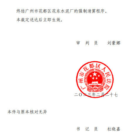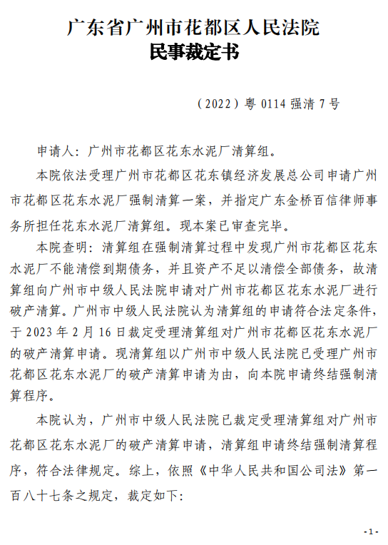 2月27日,廣東省廣州市花都區(qū)人民法院民事裁定書提到,清算組在強(qiáng)制清算過程中發(fā)現(xiàn)廣州市花都區(qū)花東水泥廠不能清償?shù)狡趥鶆?wù),并且資產(chǎn)不足以清償全部債務(wù),故清算組向廣州市中級人民法院申請對廣州市花都區(qū)花東水泥廠進(jìn)行破產(chǎn)清算。廣州市中級人民法院認(rèn)為清算組的申請符合法定條件,于 2023 年 2 月 16 日裁定受理清算組對廣州市花都區(qū)花東水泥廠的破產(chǎn)清算申請。清算組以廣州市中級人民法院已受理廣州市花都區(qū)花東水泥廠的破產(chǎn)清算申請為由,向法院申請終結(jié)強(qiáng)制清算程序。