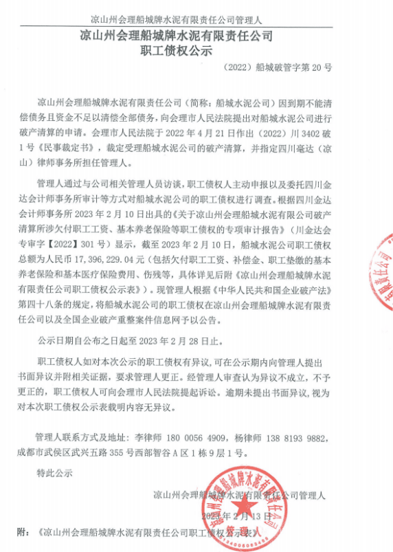 2月13日,涼山州會理船城牌水泥有限責(zé)任公司管理人發(fā)布職工債權(quán)公示稱,會理市人民法院于2022年4月21日作出裁定受理船城水泥公司的破產(chǎn)清算,并指定四川毫達(dá)(諒山)律師事務(wù)所擔(dān)任管理人。截至2023年2月10日,船城水泥公司職工債權(quán)總額為人民幣17,396,229.04元(包括欠付職工工資、補(bǔ)償金、職工墊繳的基本養(yǎng)老保險和基本醫(yī)療保險費(fèi)用、傷殘等。