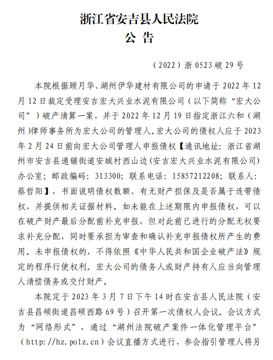 1月9日安吉縣人民法院公告,法院根據(jù)顧月華、湖州伊華建材有限公司的申請于 2022 年 12月 12 日裁定受理安吉宏大興業(yè)水泥有限公司破產(chǎn)清算一案,并于 2022 年 12 月 19 日指定浙江六和(湖州)律師事務(wù)所為宏大公司的管理人。