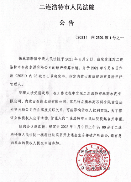 1月3日二連浩特市人民法院發(fā)布公告稱,錫林郭勒盟中級人民法院于 2021 年4月2日,裁定受理對二連浩特市泰高水泥有限公司的破產(chǎn)清算申請,并指定內(nèi)蒙古蒙信律師事務(wù)所擔(dān)任管理人。