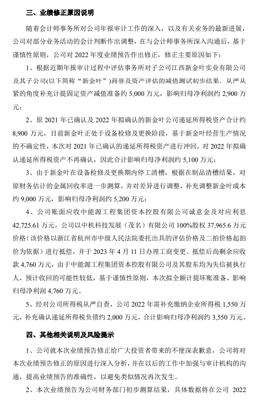 金圓股份還提到公司賬面應收中能源工程集團資本控股有限公司誠意金及對應利息42725.61萬元,公司以中機科技發展(茂名)有限公司100%股權37965.6萬元價格進行抵償,并于2023年4月11日辦理工商變更。抵償后尚剩余應收款4760萬元,由于中能源工程集團資本控股有限公司及其股東均為失信被執行人,預計收回的可能性較低,基于謹慎性原則,本次擬全額計提壞賬準備,影響歸母凈利潤4760萬元。
