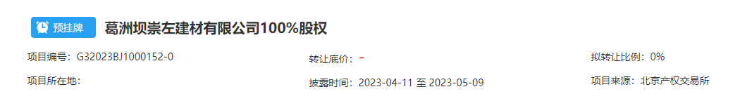 葛洲壩崇左建材有限公司100%股權預掛牌,披露結束日期為2023年5月9日。企業2023年3月31日財務報表顯示,資產總計27936.07萬元,負債總計27836.07萬元,所有者權益100萬元。