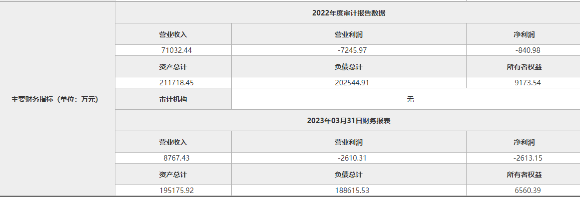 企業2023年3月31日財務報表顯示,資產總計195175.92萬元,負債總計188615.53萬元,所有者權益6560.39萬元,營業收入8767.43萬元,營業利潤-2612.68萬元,凈利潤-2613.15萬元。