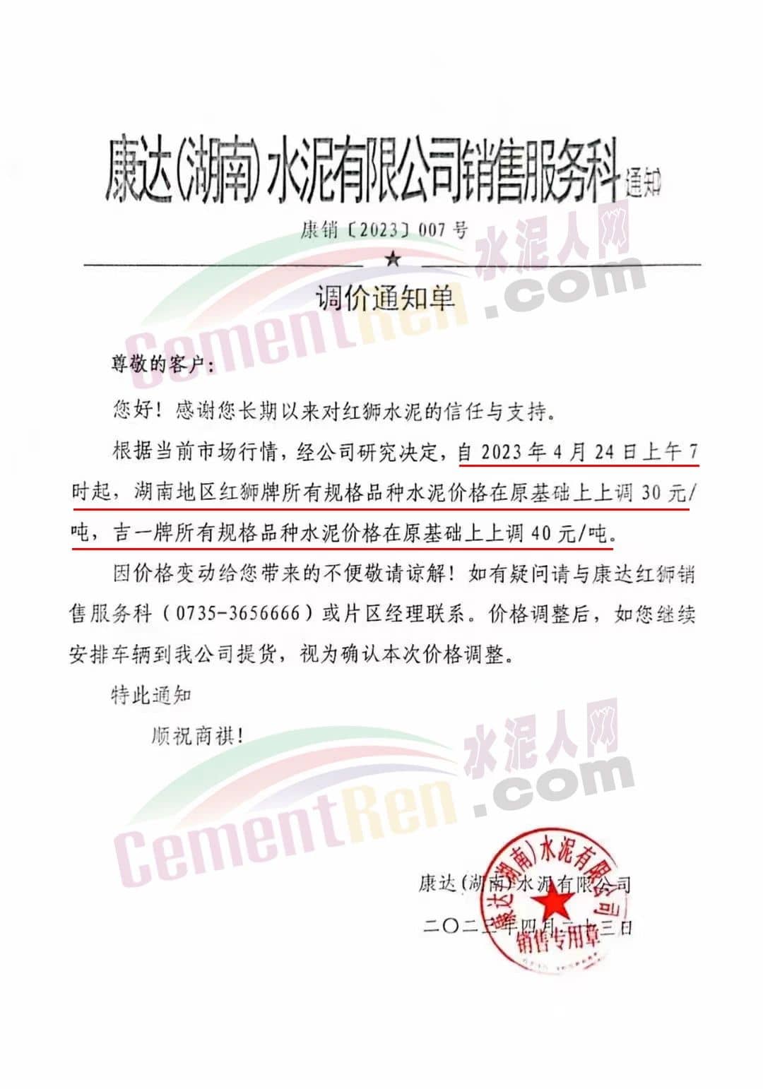 與上述區域類似,湖南區域紅獅水泥旗下康達湖水泥有限公司銷售服務科通知稱,根據當前市場行情,經公司研究決定,自2023年4月24日上午7時起,湖南地區紅獅牌所有規格品種水泥價格在原基礎上上調30元/噸,吉一牌所有規格品種水泥價格在原基礎上上調40元/噸。