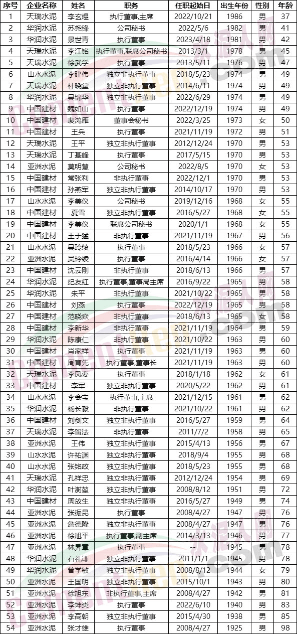 據水泥人網了解,部分水泥集團已明確年齡在58歲的高管退居二線,從上市公司公布的數據也可見出生于1970-1980年間的管理層為目前行業的主力,且多為本科及以上學歷。