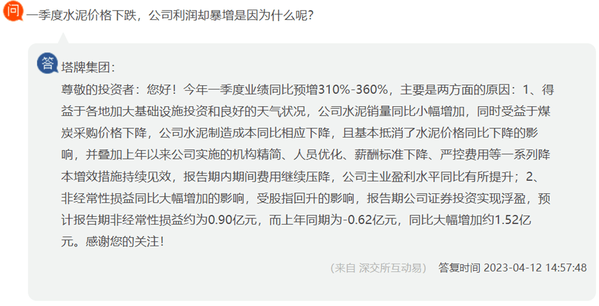 此前塔牌水泥在回復投資者提問時表示,自上年以來公司實施的機構精簡、人員優化、薪酬標準下降、嚴控費用等一系列降本增效措施持續見效,今年一季度期間費用繼續壓降,公司主業盈利水平同比有所提升。