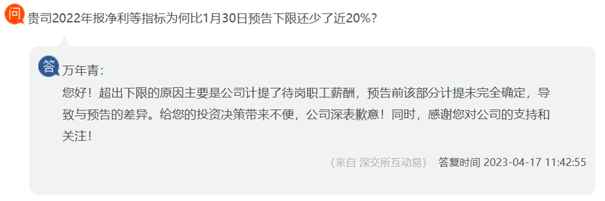 萬年青水泥上市公司在向投資者解釋為什么企業2022年凈利潤等指標比1月30日預告下限還少了近20%時表示,超出下限的原因主要是公司計提了待崗職工薪酬,預告前該部分計提未完全確定,導致與預告的差異。