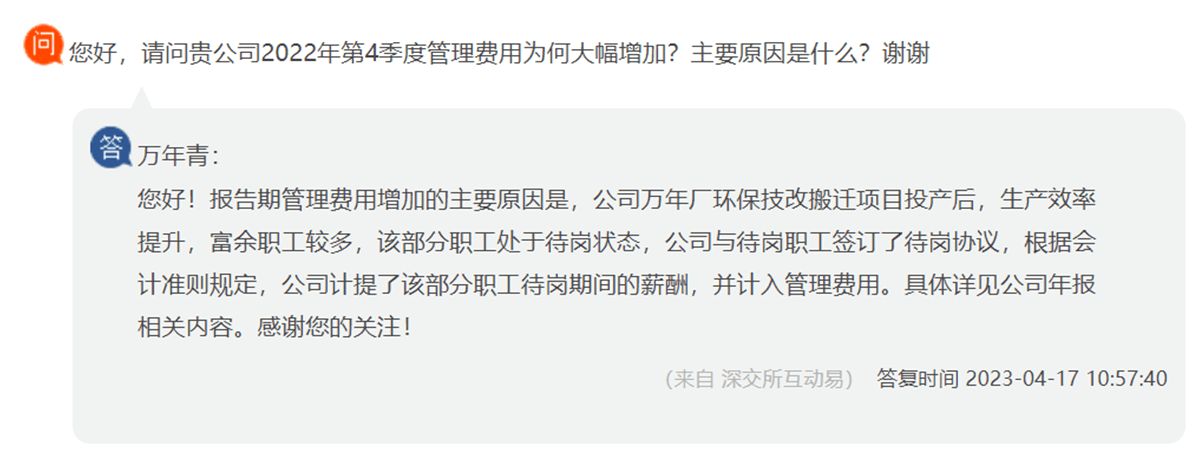 并提及2022年管理費用增加的主要原因是,公司萬年廠環保技改搬遷項目投產后,生產效率提升,富余職工較多,該部分職工處于待崗狀態,公司與待崗職工簽訂了待崗協議,根據會計準則規定,公司計提了該部分職工待崗期間的薪酬,并計入管理費用。