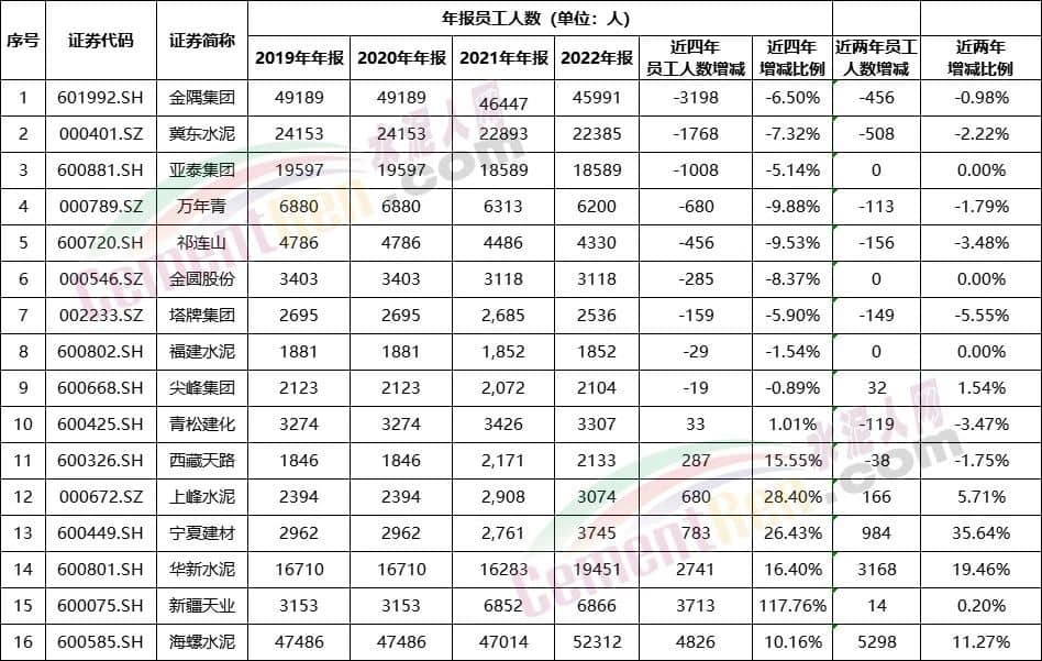從2019~2022年16家水泥上市公司員工人數增減數據可見近四年來,金隅集團、冀東水泥、亞泰集團員工都有千人以上的減員。萬年青、祁連山、塔牌水泥均有百人以上的減員。2021~2012年金隅集團、冀東水泥、萬年青、祁連山、塔牌集團、青松建化等均有百人以上的減員,冀東水泥減員達500人以上。