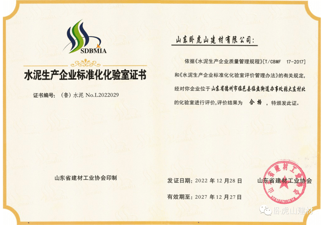 多年來,臥虎山建材出品水泥在省、市化驗室的檢驗結(jié)果都是業(yè)內(nèi)佼佼者,憑借強大的技術(shù)力量、先進的生產(chǎn)設(shè)備、可靠的原料質(zhì)量和過硬的產(chǎn)品質(zhì)量,臥虎山建材先后獲得全省水泥生產(chǎn)企業(yè)標準化化驗室證書、全省2022年水泥物理檢驗和化學(xué)分析大對比全合格單位等榮譽稱號。