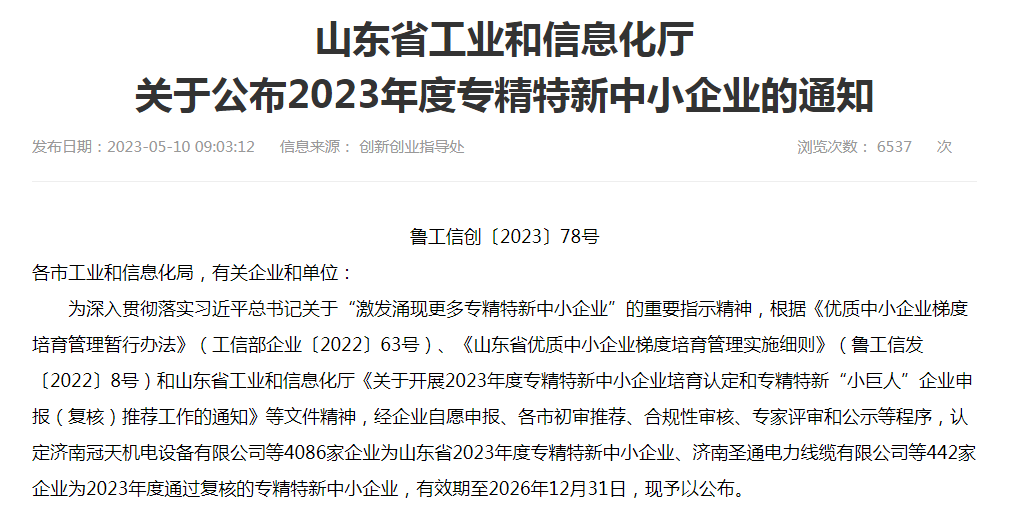 5月10日,山東省工業和信息化廳發布“2023年度專精特新中小企業”通知名單,山東永正產業技術研究院憑借自身實力和專業技術,通過層層專業評審榮登榜單。