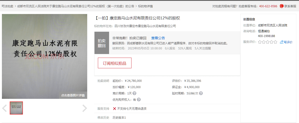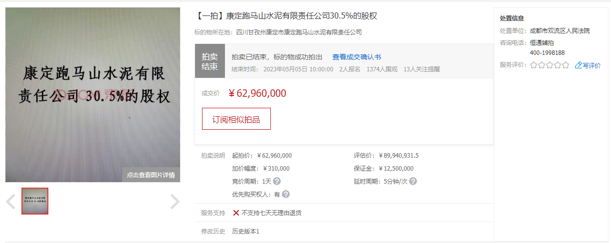 同期,康定跑馬山水泥有限責(zé)任公司30.5%的股權(quán)于5月5日被成功拍出,并未受到成都蓉聯(lián)水泥有限公司破產(chǎn)的影響。成交確認(rèn)書顯示,經(jīng)公開競價,競買人成都佰聯(lián)勝機(jī)電設(shè)備有限公司在京東網(wǎng)拍平臺以最高價競得本拍賣標(biāo)的,拍賣成交價為6296萬元。