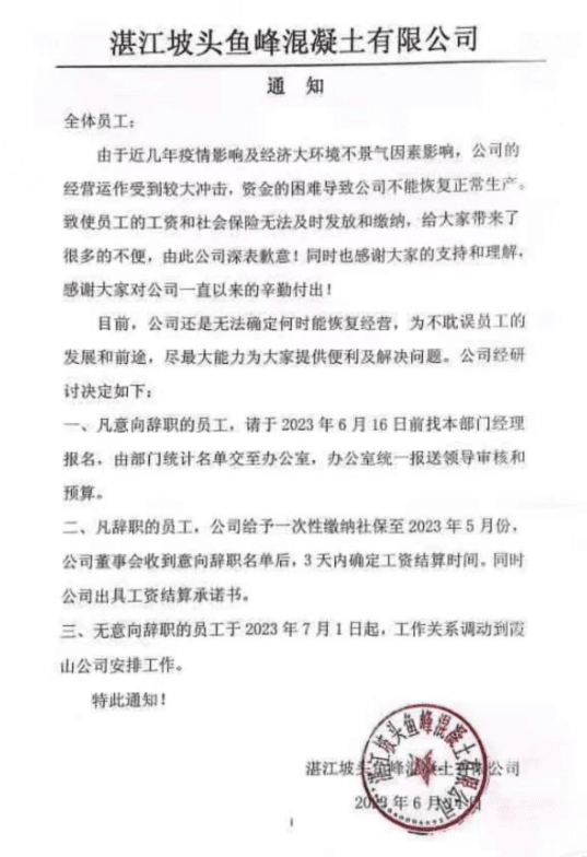 日前,廣東湛江坡頭魚峰混凝土有限公司發通知給員工稱,由于近幾年疫情影響及經濟大環境不景氣因素影響,公司的經營運作受到較大沖擊,資金的困難導致公司不能恢復正常生產,致使員工的工資和社會保險無法及時發放和繳納。目前,公司無法確定何時能恢復經營,為不耽誤員工的發展和前途,為員工提供了離職與調動方案。