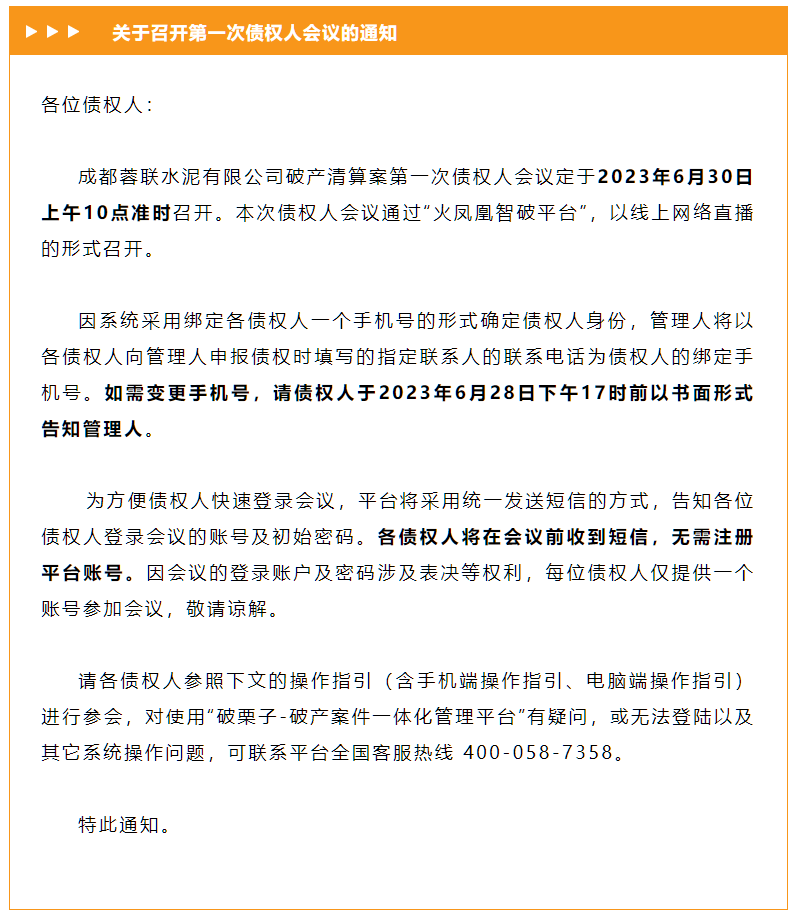 6月21日,雙流法院微發布微信公眾號發布《成都蓉聯水泥有限公司破產清算案第一次債權人會議通知及操作指引》提到,成都蓉聯水泥有限公司破產清算案第一次債權人會議定于2023年6月30日上午10點準時召開。
