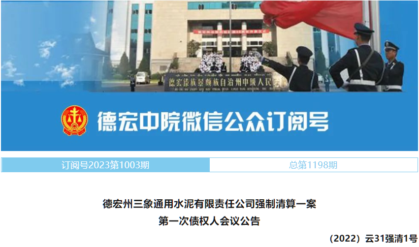 6月19日,德宏中院發布《德宏州三象通用水泥有限責任公司強制清算一案第一次債權人會議公告》稱,定于2023年6月28日上午9時30分以網絡會議形式召開德宏州三象通用水泥有限責任公司第一次債權人會議。