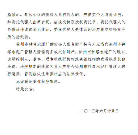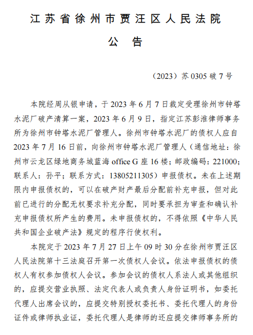 江蘇省徐州市賈汪區人民法院公告于2023年6月7日裁定受理徐州市鐘塔水泥廠破產清算一案,2023年6月9日,指定江蘇彭淮律師事務所為徐州市鐘塔水泥廠管理人。