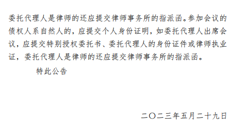 參加會議的債權人是法人或其他組織的,應當提供營業執照、法定代表人或負責人身份證明書,如委托代理人參加的,還應當提供特別授權委托書、委托人身份證或律師執業證,委托代理人是律師的還應提交律師事務所的指派函,并于2023年6月28日上午9點20分登錄破易云平臺(方式一:手機微信搜索“破易云”小程序,在登錄頁中輸入手機號、獲取短信驗證碼并輸入案件識別碼:111481,登錄參會;方式二:電腦瀏覽器訪問網址https://zqr.poyiyun.com/ 登錄后參與會議,本案件識別碼:111481)召開德宏州三象通用水泥有限責任公司強制清算案第一次債權人正式會議,本次會議開始前管理人將會議文本上傳至破易云平臺,請債權人及時登陸破易云平臺下載查閱。請各位債權人準時登錄系統,點擊進入債權人會議,通過網絡方式參與會議和投票表決。