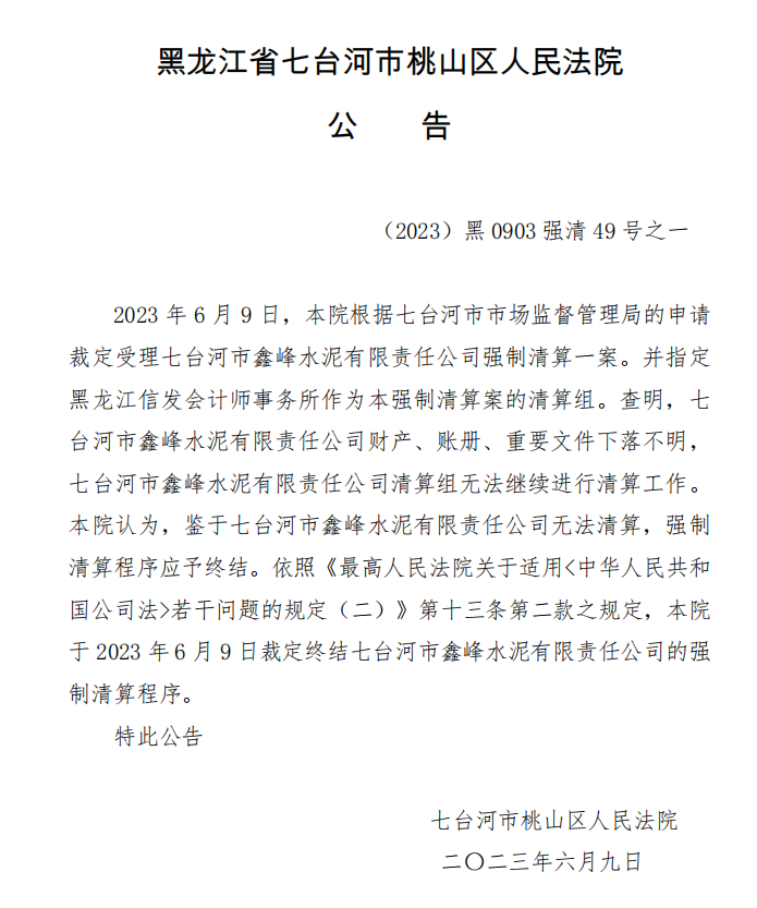 2023年6月9日,黑龍江省七臺河市桃山區人民法院根據七臺河市市場監督管理局的申請裁定受理七臺河市鑫峰水泥有限責任公司強制清算一案。并指定黑龍江信發會計師事務所作為本強制清算案的清算組。
