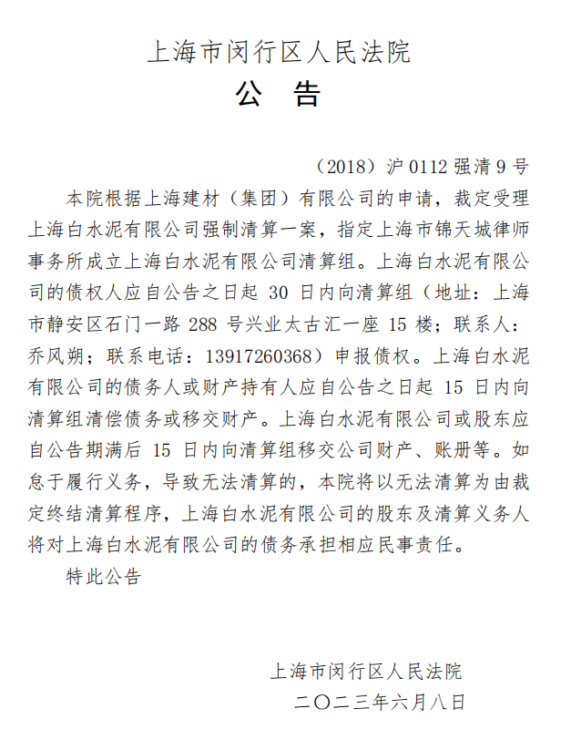 上海市閔行區人民法院公告,根據上海建材(集團)有限公司的申請,裁定受理上海白水泥有限公司強制清算一案,指定上海市錦天城律師事務所成立上海白水泥有限公司清算組。