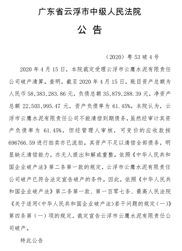 2020年4月15日,廣東省云浮市中級人民法院裁定受理云浮市云鷹水泥有限責任公司破產清算,并裁定宣告云浮市云鷹水泥有限責任公司破產。