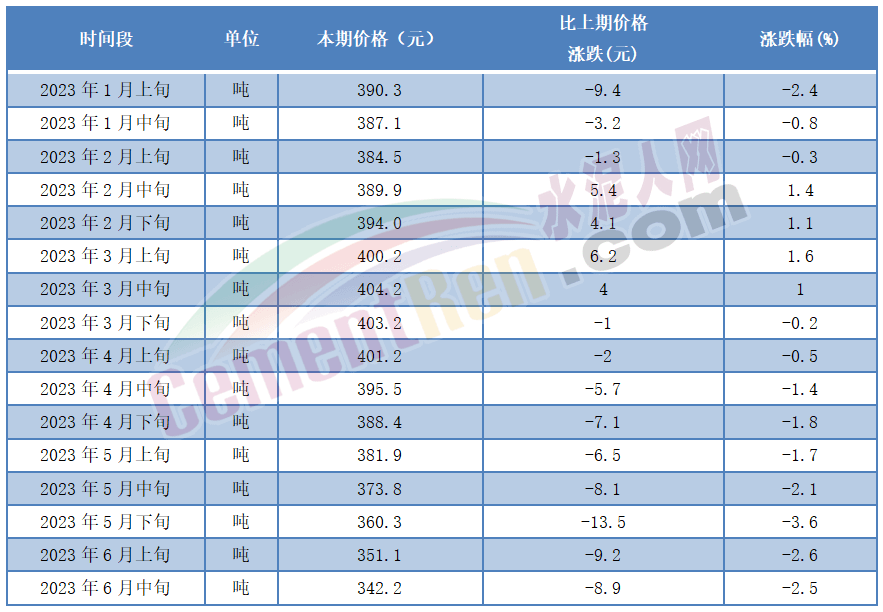 廣西區(qū)域某品牌企業(yè)銷售負責人表示:淡季市場“全國統(tǒng)一”行情。從國家統(tǒng)計局近日發(fā)布的2023年6月中旬流通領域水泥市場價格變動情況可見,雖煤炭價格出現(xiàn)小幅回升,但水泥價格仍持續(xù)下跌,P.O42.5散裝水泥較6月上旬下跌8.9元/噸,又一次刷新近五年來的價格最低點。