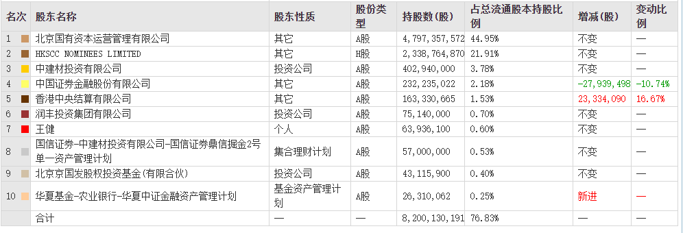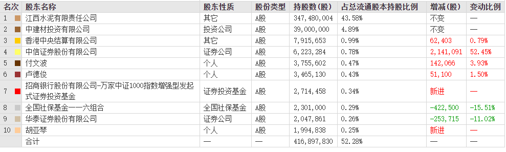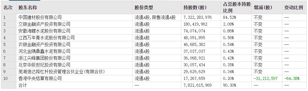 水泥人網注意到,天山水泥10大股東內不僅有其母公司中國建材股份有限公司,還有海螺水泥、萬年青水泥、金隅鼎鑫、尖峰集團等同行業企業,其中海螺水泥持股比例為4.48%。