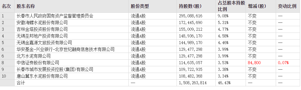 亞泰集團十大股東中,海螺水泥以持股比例5.31%排名第2,北方水泥持股3.99%排名第6,冀東水泥持股3.34%排名第10。