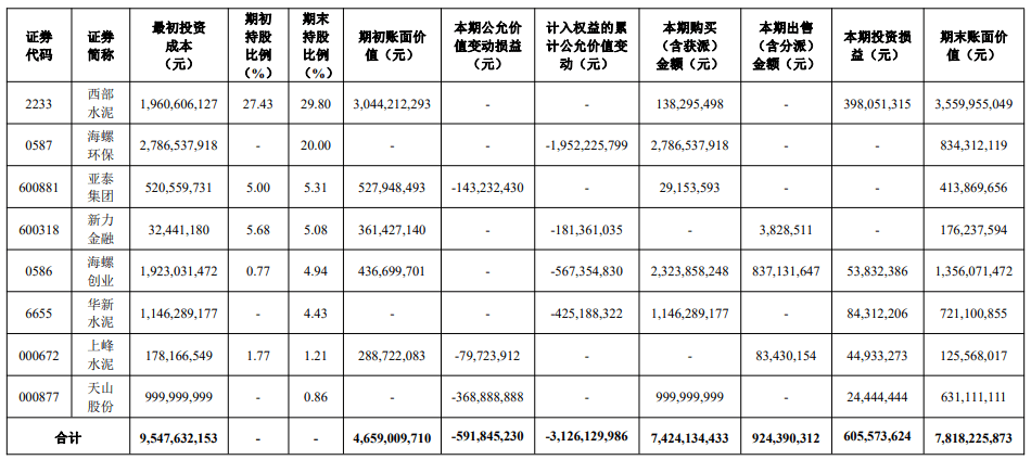 報告顯示,海螺水泥持有的新力金融、海螺創業、華新水泥計入“其他權益工具投資”科目,海螺環保、西部水泥計入“長期股權投資”科目,亞泰集團、上峰水泥、天山股份計入“交易性金融資產”科目。