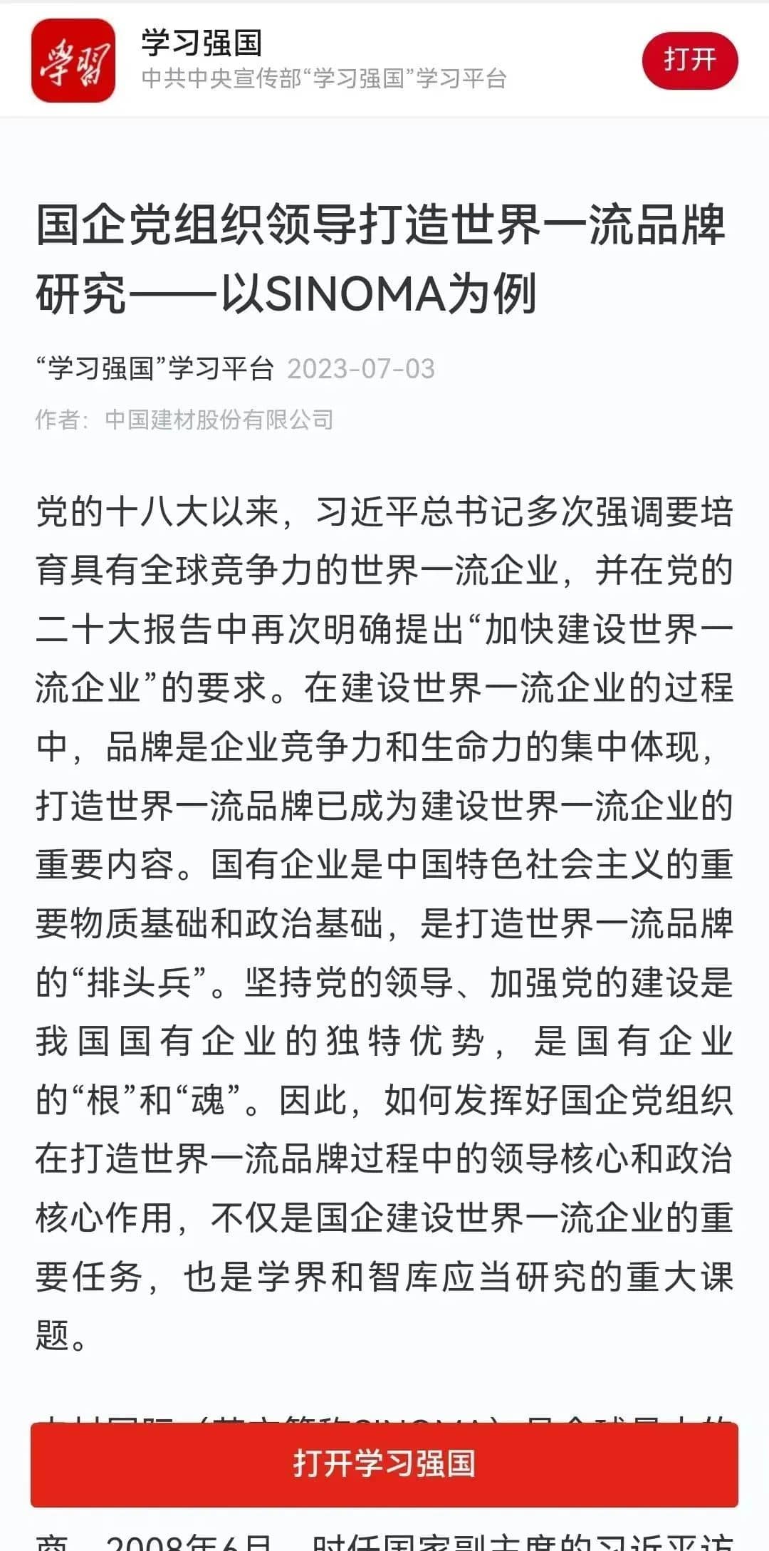 這是對公司黨委工作的肯定和勉勵,也是鼓舞我們砥礪前行的不竭動力。透過文字,我們可以感受到中材國際黨委對黨的赤誠和忠心,可以感受到對黨建工作的堅定執著和創先爭優,還可以感受對建設世界一流品牌的擔當和使命!