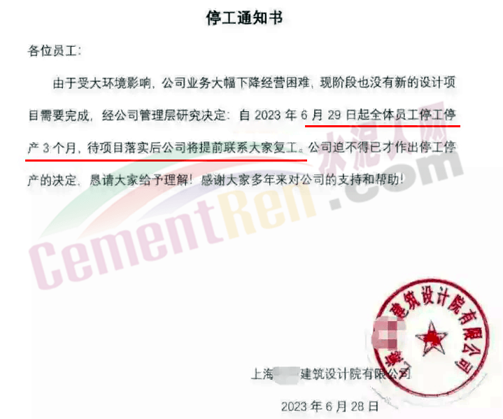 日前,上海某甲級設計院因為沒有業務不得不宣告全體員工停工停產。企業通知書稱,由于受大環境影響,公司業務大幅下降經營困難,現階段也沒有新的設計項目需要完成。經公司管理層研究決定,自2023 年6月29 日起全體員工停工停產3個月,待項目落實后公司將提前聯系大家復工。公司迫不得已才作出停工停產的決定。