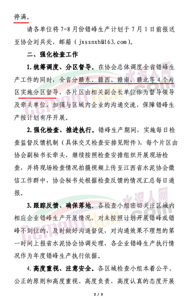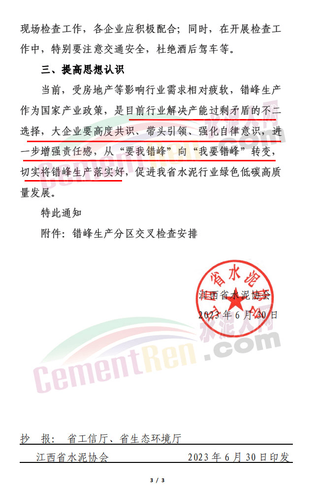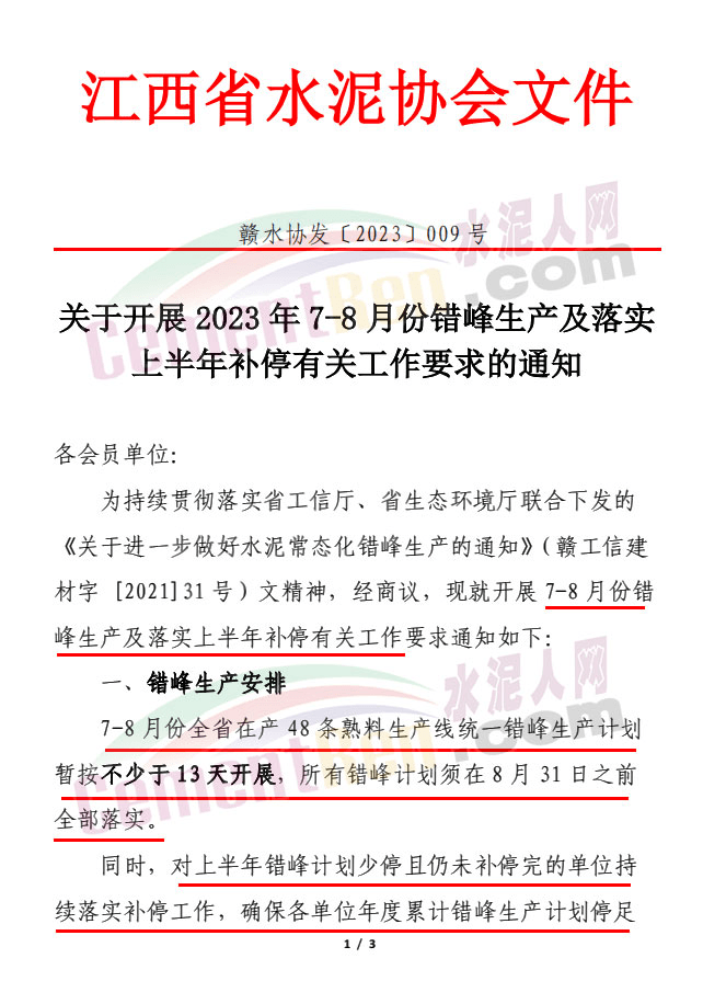 日前,江西省水泥協會通知全省在產 48 條熟料生產線將在7-8 月份統一錯峰生產13天以上,通知文件提到,當前,受房地產等影響行業需求相對疲軟,錯峰生產作為國家產業政策,是目前行業解決產能過剩矛盾的不二選擇,大企業要高度共識、帶頭引領、強化自律意識,進一步增強責任感,從“要我錯峰”向“我要錯峰”轉變切實將錯峰生產落實好。