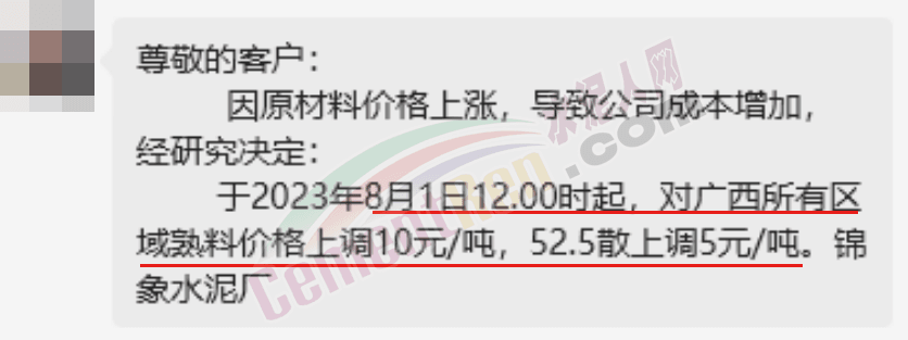水泥人網(wǎng)消息:日前,廣西錦象水泥通知,因原材料價格上漲,導致公司成本增加,經(jīng)研究決定:于2023年8月1日12時起,對廣西所有區(qū)域熟料價格上調(diào)10元/噸,52.5散上調(diào)5元/噸。