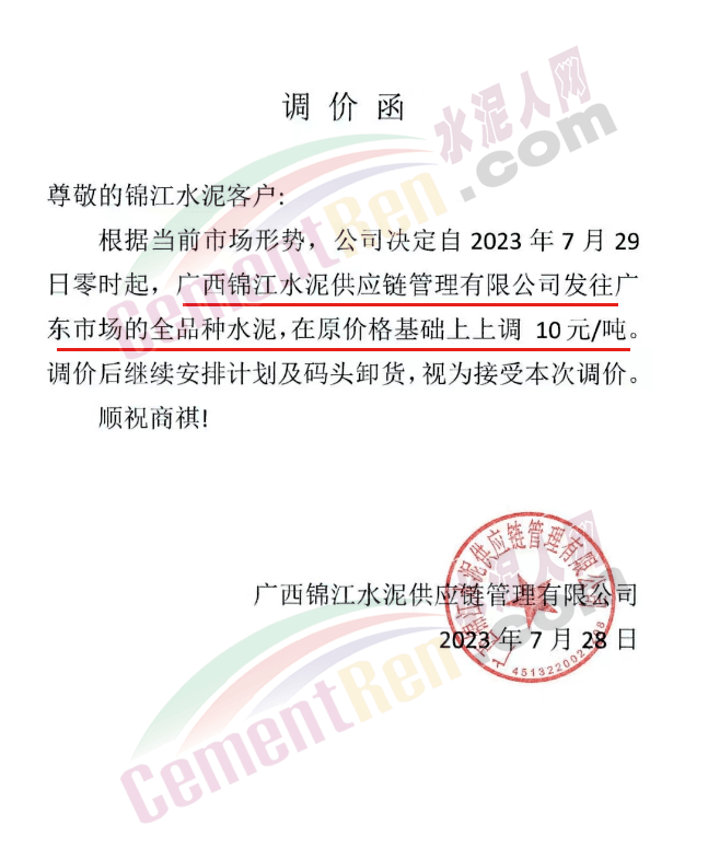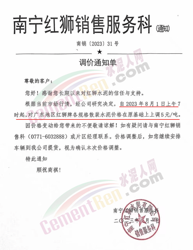 同期,南寧紅獅銷售服務科通知,根據(jù)當前市場行情,經(jīng)公司研究決定,自2023年8月1日上午7時起,對廣東地區(qū)紅獅牌各規(guī)格散裝水泥價格在原基礎上上調(diào)5元/噸。