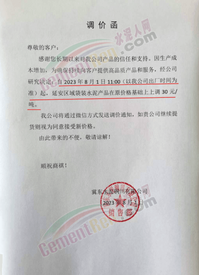 同日,陜西冀東水泥銅川公司通知,因生產(chǎn)成本增加,為確保持續(xù)向客戶提供高品質(zhì)產(chǎn)品和服務,經(jīng)公司研究決定,自2023年8月1日11時起,延安區(qū)域袋裝水泥產(chǎn)品在原價格基礎上上調(diào)30元/噸。