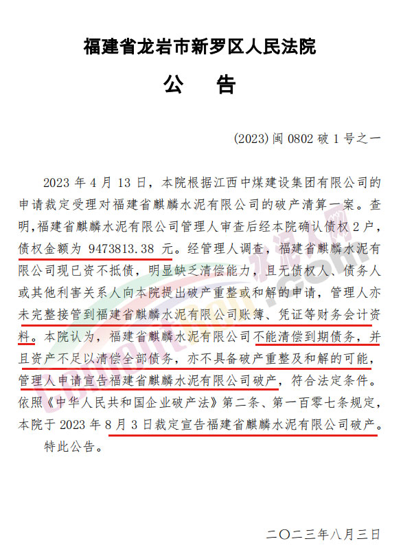 8月3日,福建省龍巖市新羅區人民法院發布公告稱:2023年4月13日,根據江西中煤建設集團有限公司的申請裁定受理對福建省麒麟水泥有限公司的破產清算一案。