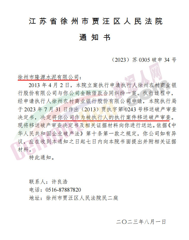 法院執行局于2023年7月31日作出(2013)賈執字第0243號移送破產審查決定書,決定將徐州市隆源水泥有限公司作為被執行人的執行案件移送破產審查。