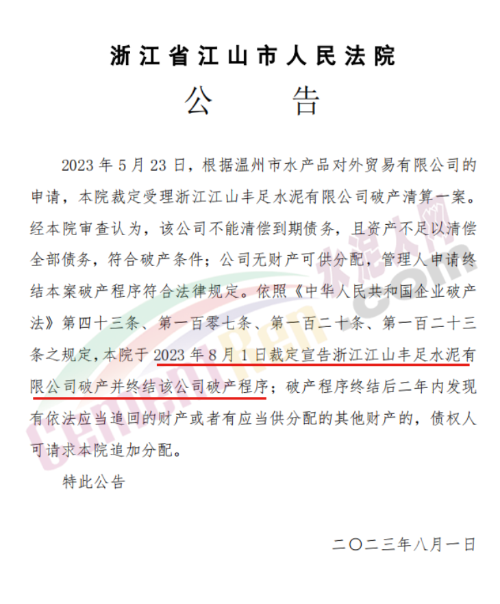8月1日浙江省江山市人民法院發布公告稱,2023年5月23日,根據溫州市水產品對外貿易有限公司的申請,裁定受理浙江江山豐足水泥有限公司破產清算一案。