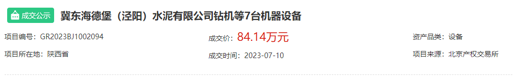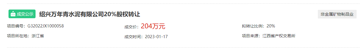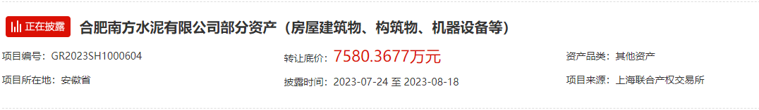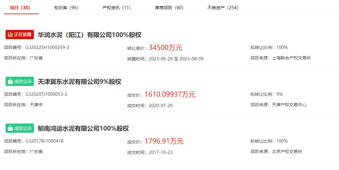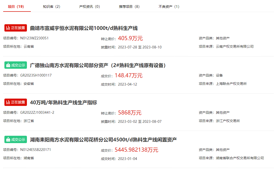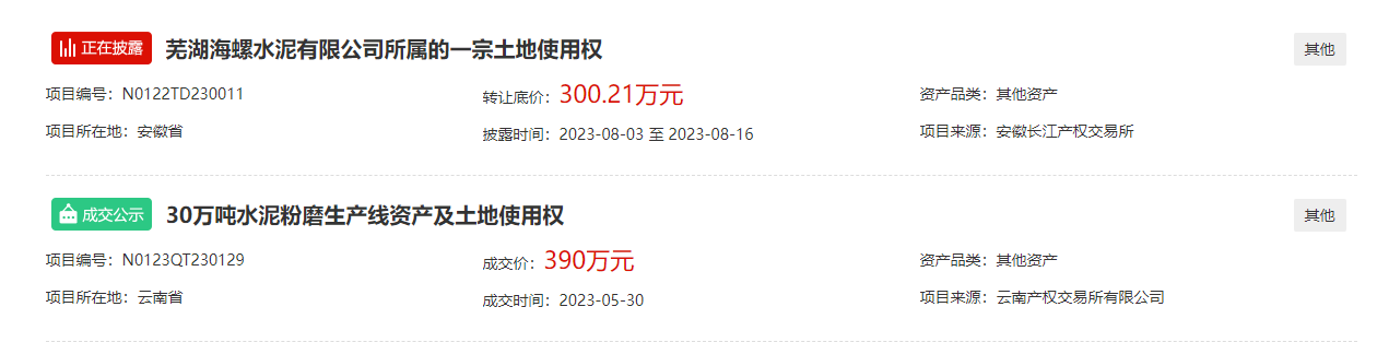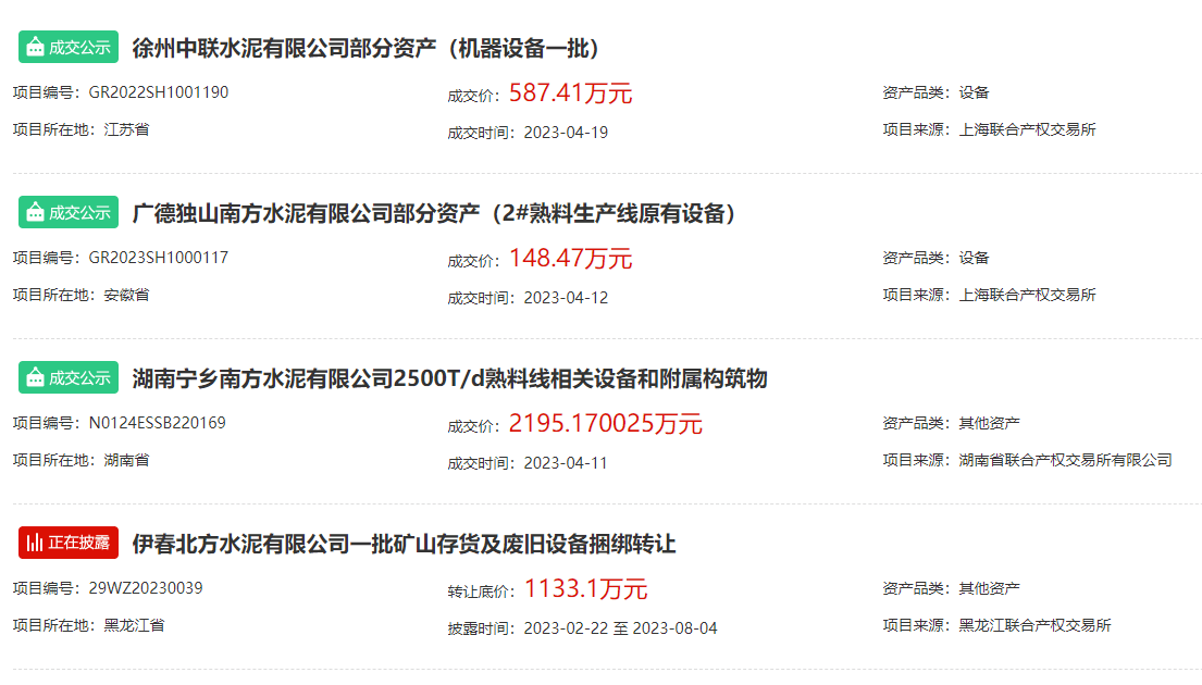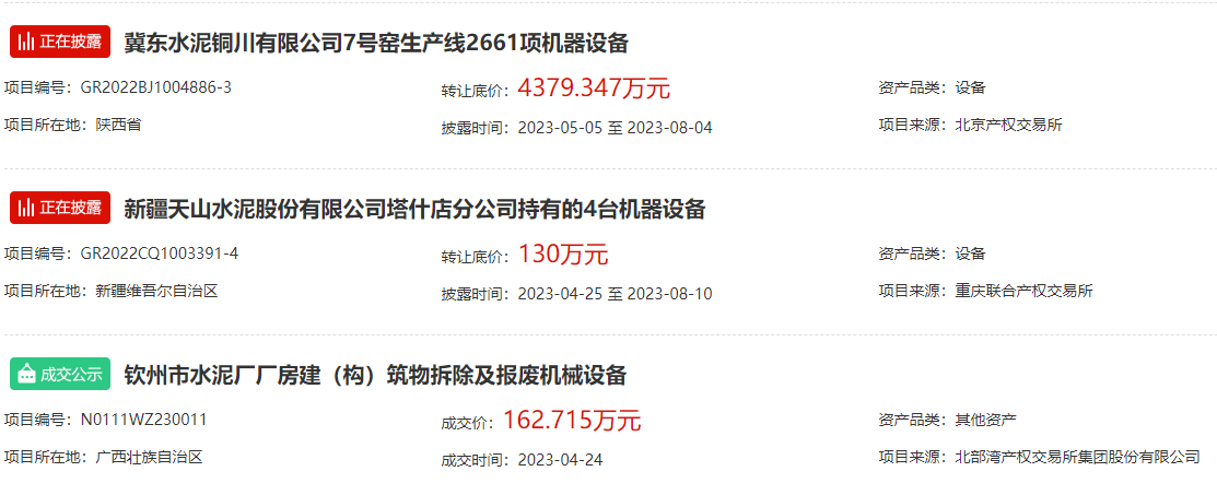 另有包含華潤水泥、冀東水泥、萬年青水泥在內的4家品牌企業公開出讓企業股權;包含行業知名企業蕪湖海螺水泥在內的兩家企業公開出讓土地使用權;包含天山水泥、中聯水泥南方水泥、北方水泥、冀東水泥在內的14家企業公開出讓熟料生產線、熟料指標、房屋建筑物、構筑物及機器設備等資產。