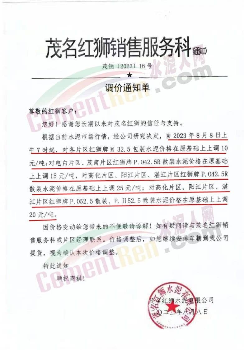 水泥人網(wǎng)通訊員消息:日前,茂名紅獅銷售服務(wù)科發(fā)通知稱,根據(jù)當(dāng)前水泥市場行情,經(jīng)公司研究決定,自2023年8月8日上午7時(shí)起,對各片區(qū)紅獅牌M32.5包裝水泥價(jià)格在原基礎(chǔ)上上調(diào)10元/噸;對電白片區(qū)、茂南片區(qū)紅獅牌PO42.5R散裝水泥價(jià)格在原基礎(chǔ)上上調(diào)15元/噸;對高化片區(qū)、陽江片區(qū)、湛江片區(qū)紅獅牌P.O42.5R散裝水泥價(jià)格在原基礎(chǔ)上上調(diào)25元/噸;對高化片區(qū)、陽江片區(qū)、湛江片區(qū)紅獅牌P.O52.5散裝、PII52.5散裝水泥價(jià)格在原基礎(chǔ)上上調(diào)20元/噸。