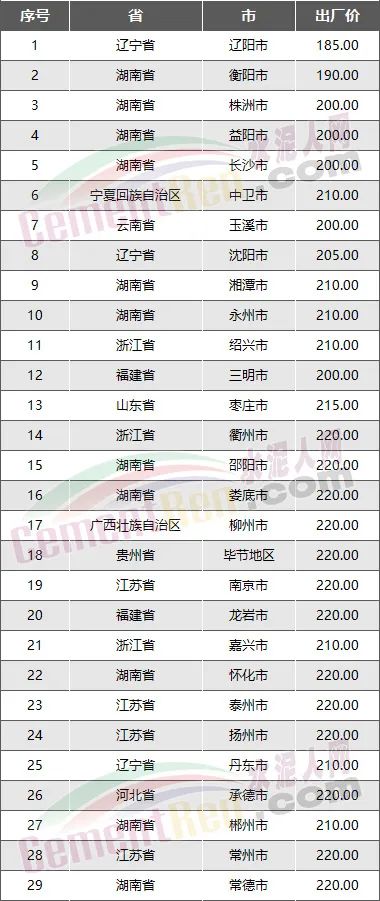 數(shù)據(jù)顯示,29個地區(qū)水泥出廠價格在220元/噸以下。其中湖南區(qū)域市場占比最多,涉及衡陽市、株洲市、益陽市、長沙市、湘潭市、永州市、邵陽市、婁底市、懷化市、郴州市、常德市11個地區(qū);某湖南市場人員反饋,目前湖南地區(qū)水泥價格已跌至近5年最低值了,且沒有明顯好轉(zhuǎn)現(xiàn)象,當(dāng)?shù)睾芏嗥髽I(yè)今年都沒開窯,熟料都是外購的,水泥窯運轉(zhuǎn)率只有40%,并且價格隨時都在變。
