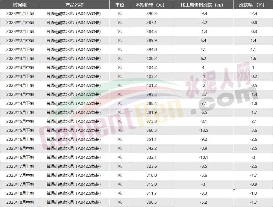 近日,國家統計局公布2023年8月中旬流通領域重要生產資料市場價格變動情況顯示,普通硅酸鹽水泥(P.O42.5散裝)水泥報價306.5元/噸,已是自3月下旬以來連續第15次價格下跌,且為自5月上旬以來第11次突破年內最低價。  圖片