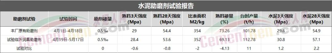 山東棗莊某水泥廠于4月1日—4月18日先試驗原有助磨劑,以其生產時間段為基數,4月19日—5月17日時間段開始試驗應用潤昌科技助磨劑,將兩段時間段進行對比。試驗結果如下所示: