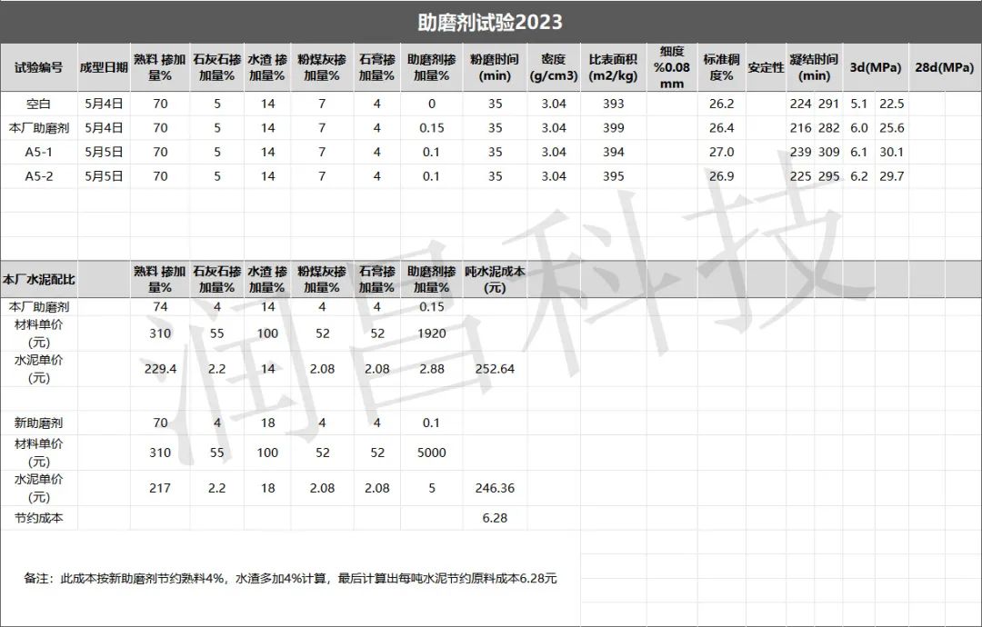 對比該水泥廠原先使用的助磨劑,使用潤昌科技A5-1、A5-2新型助磨劑水泥三天強度分別增加4.5MPa,4.1MPa,熟料摻量減少4%,混合材摻量增加4%,綜合計算下來每噸水泥節約原料成本6.28元。