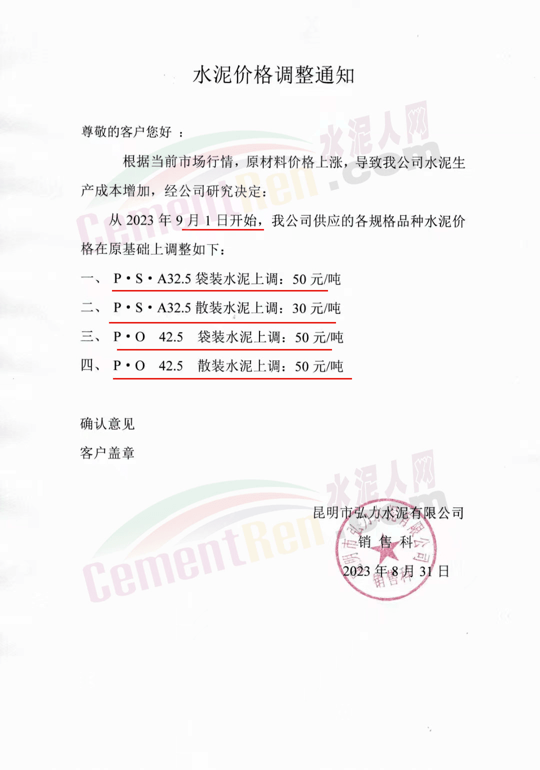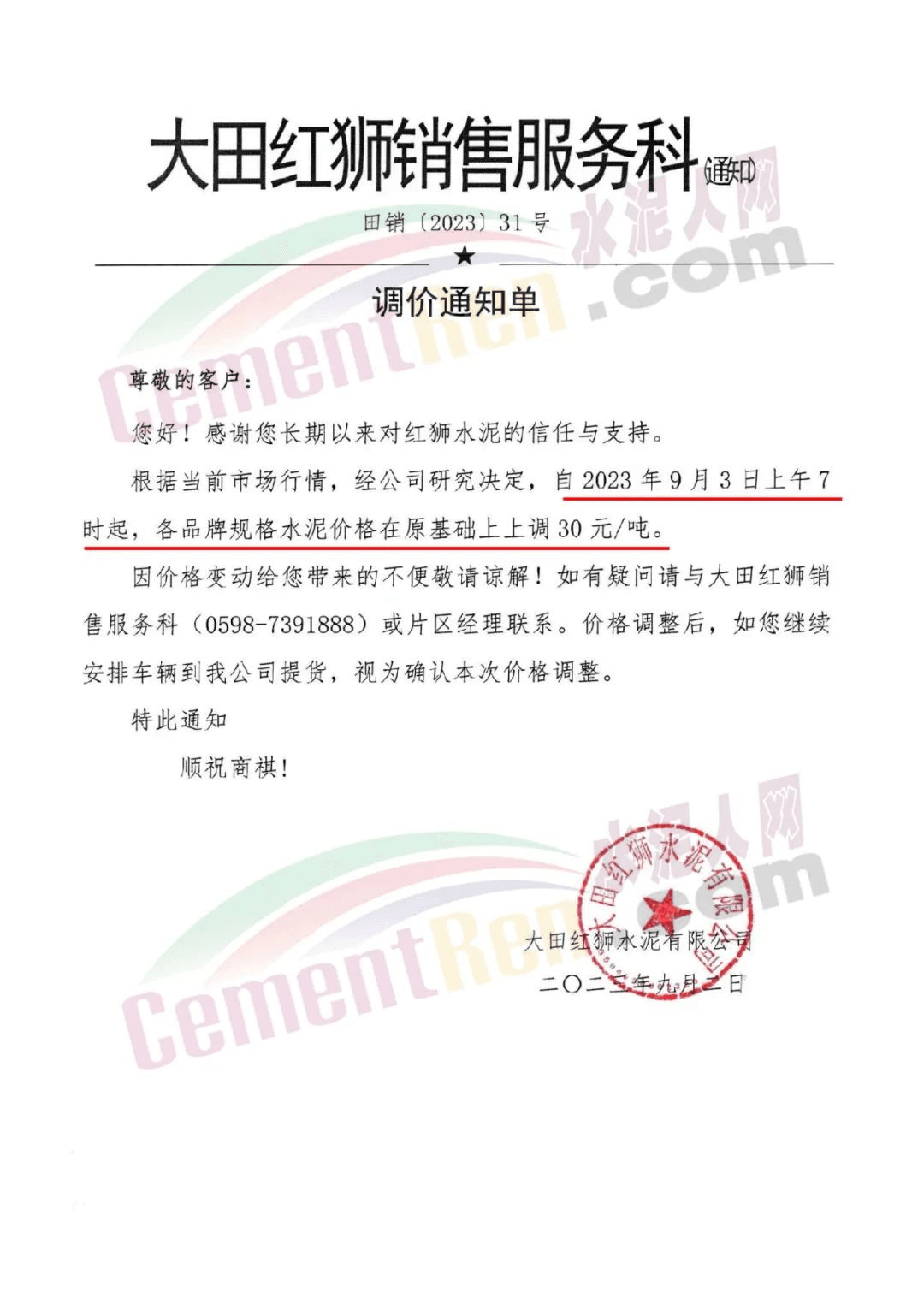 龍海紅獅、大田紅獅銷售服務科通知,根據當前市場行情,經公司研究決定,自2023年9月3日上午7時起,各品牌各規格品種水泥價格在原基礎上上調30元/噸。