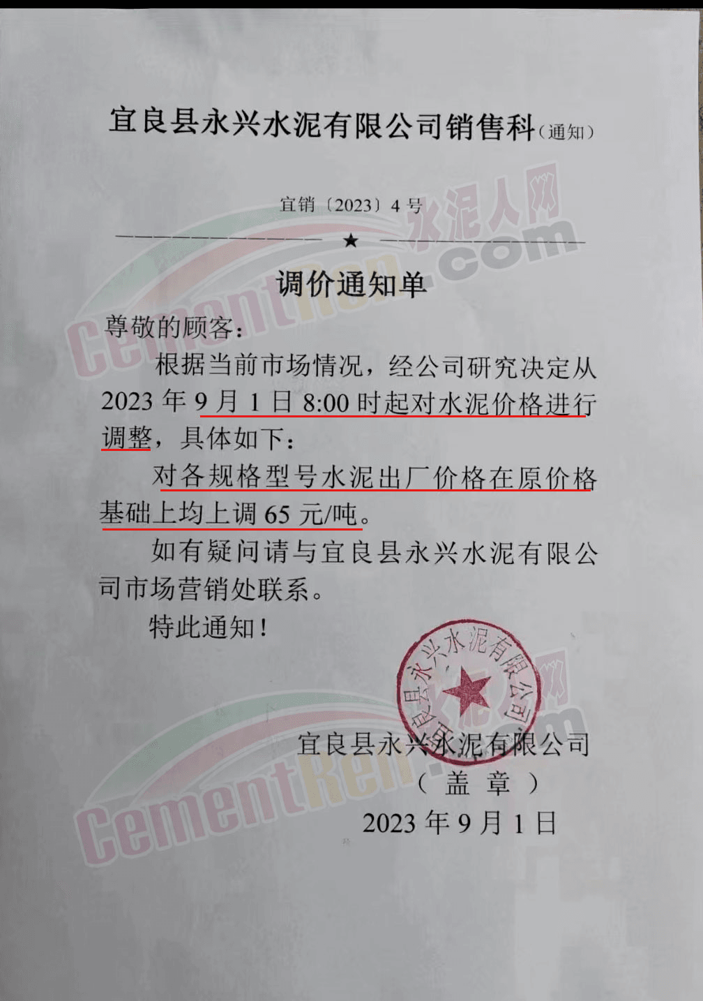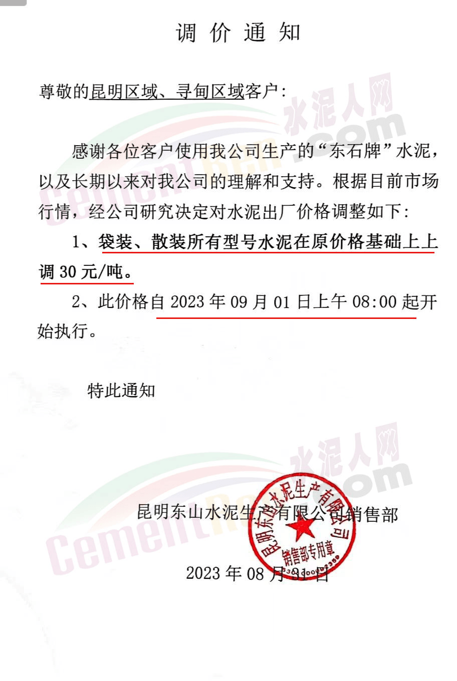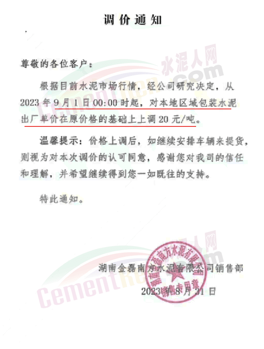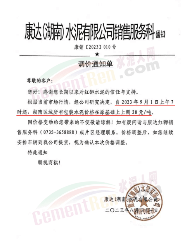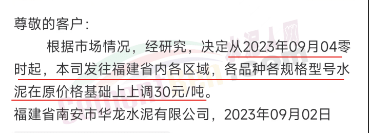 福建省南安市華龍水泥有限公司通知,根據市場情況,經研究決定從2023年9月4日零時起,發往福建省內各區域、各品種各規格型號水泥在原價格基礎上上調30元/噸。