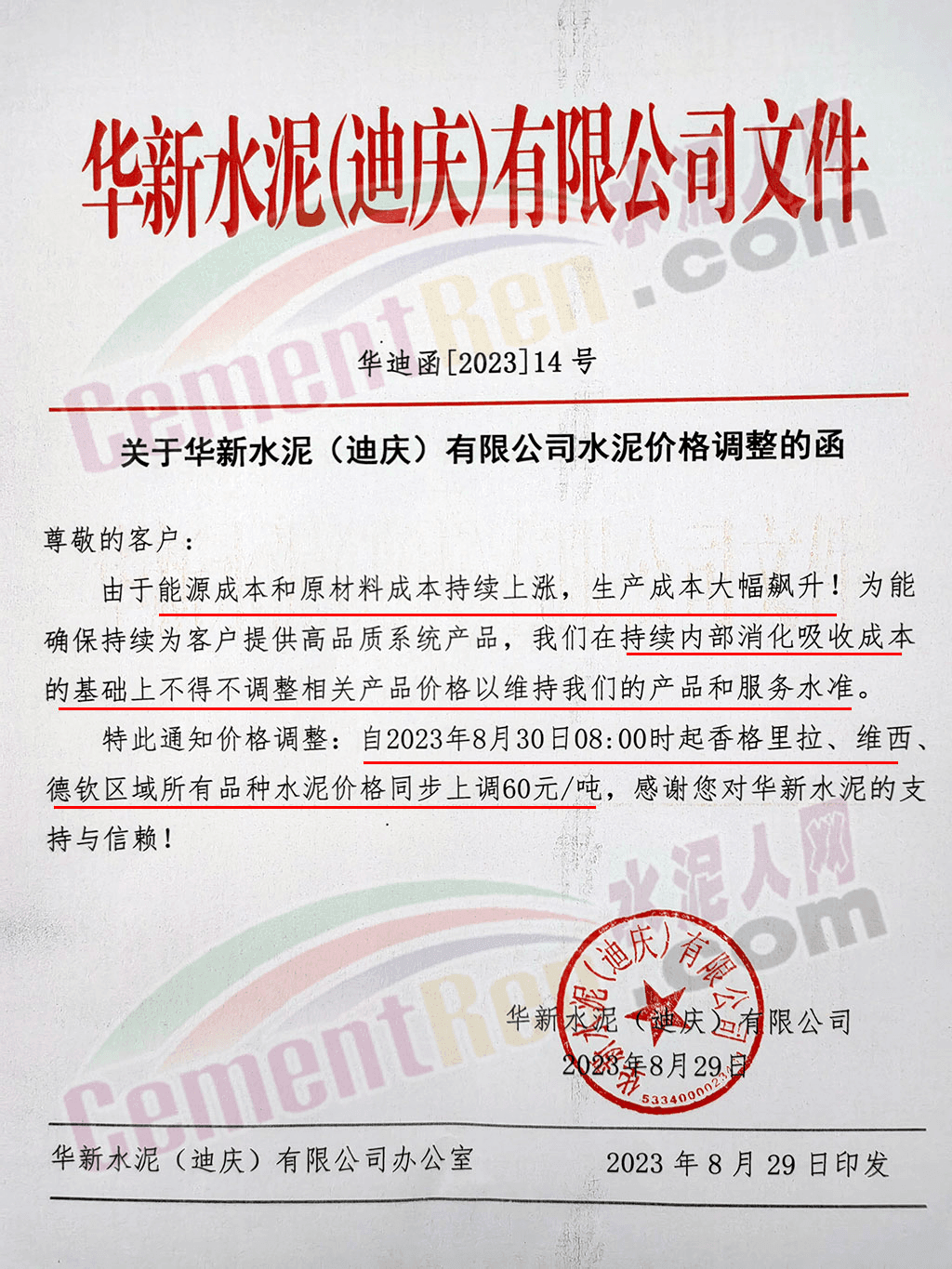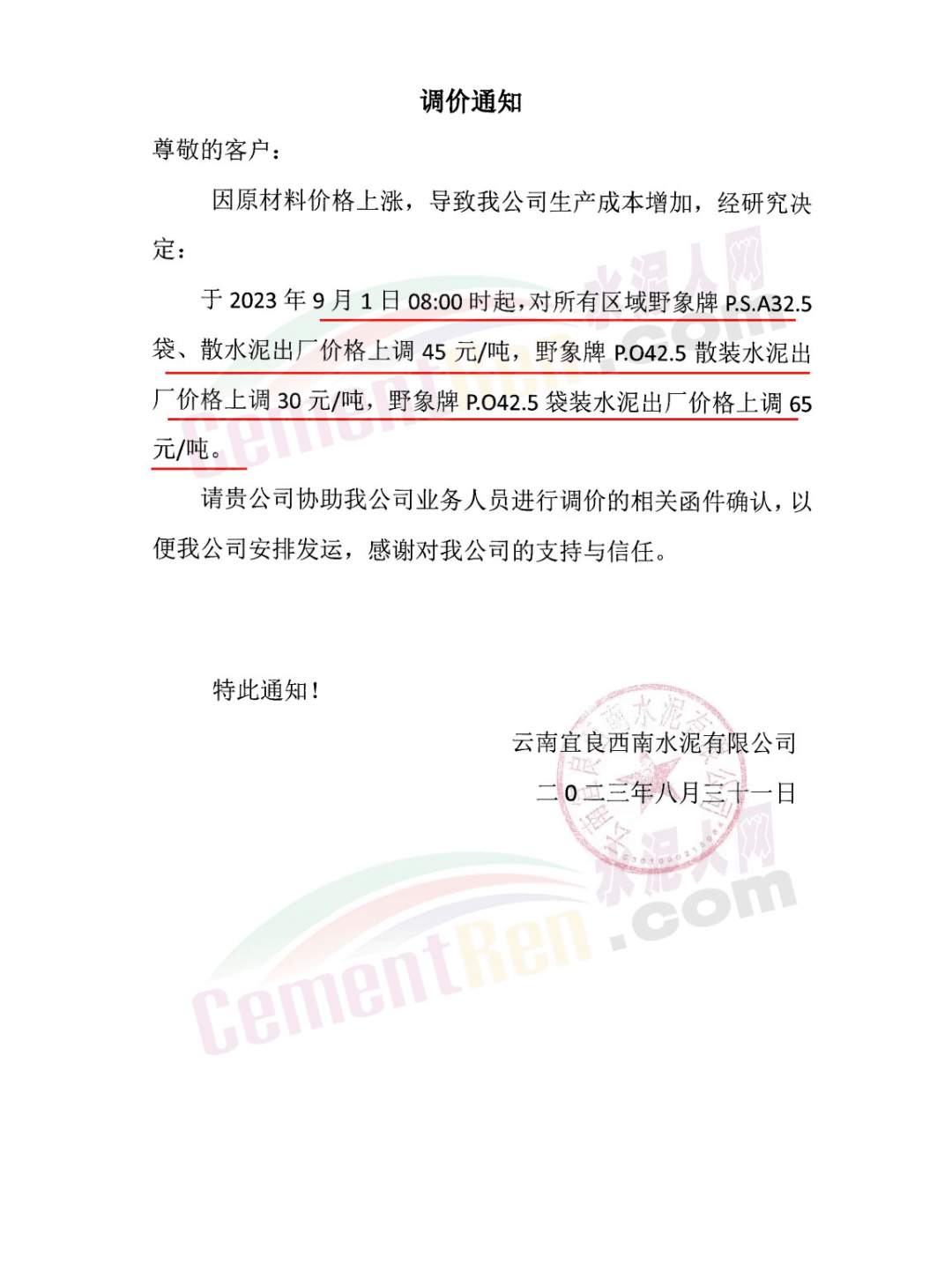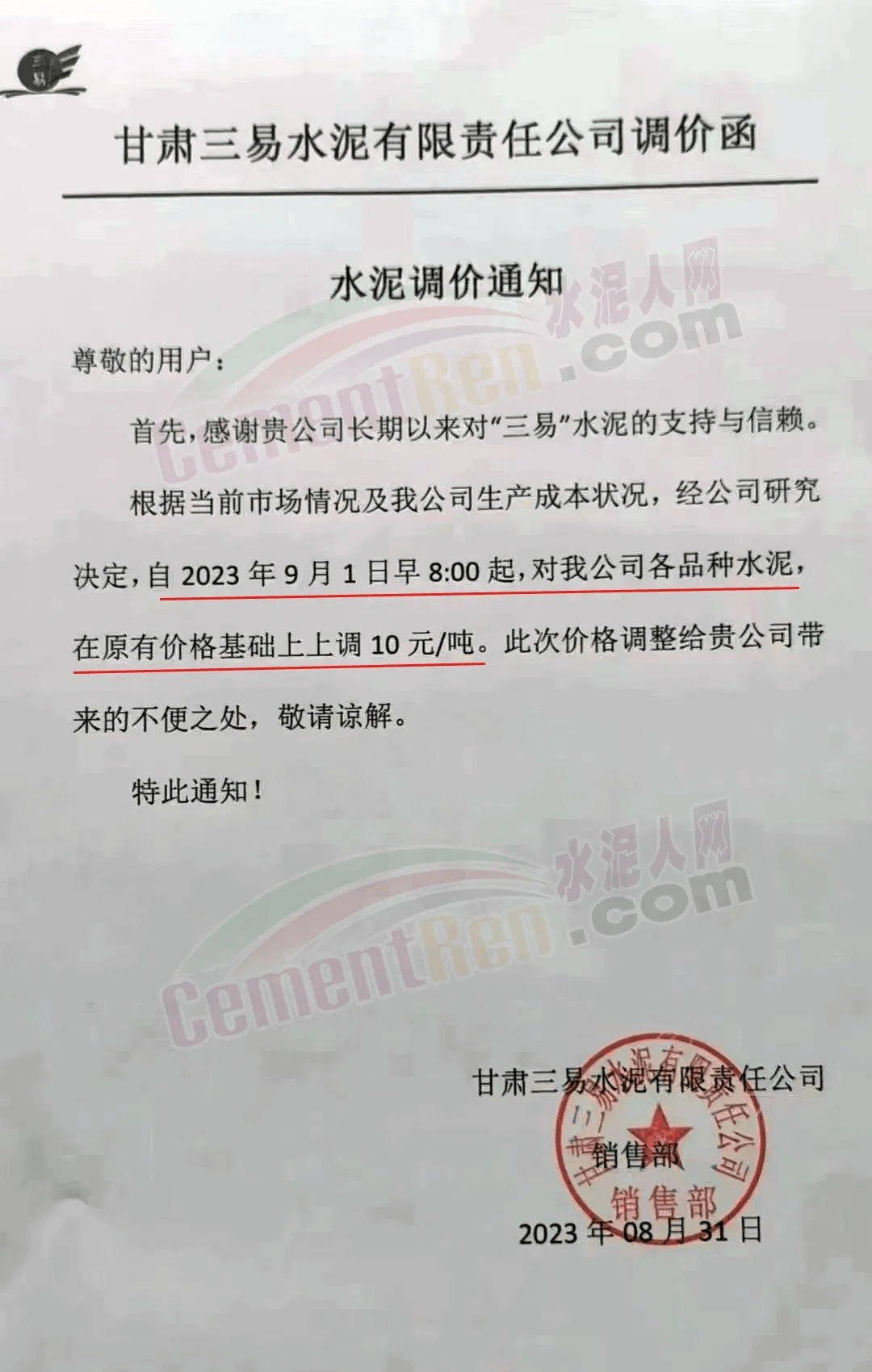 福建省南安市華龍水泥有限公司通知,根據市場情況,經研究決定從2023年9月4日零時起,發往福建省內各區域、各品種各規格型號水泥在原價格基礎上上調30元/噸。