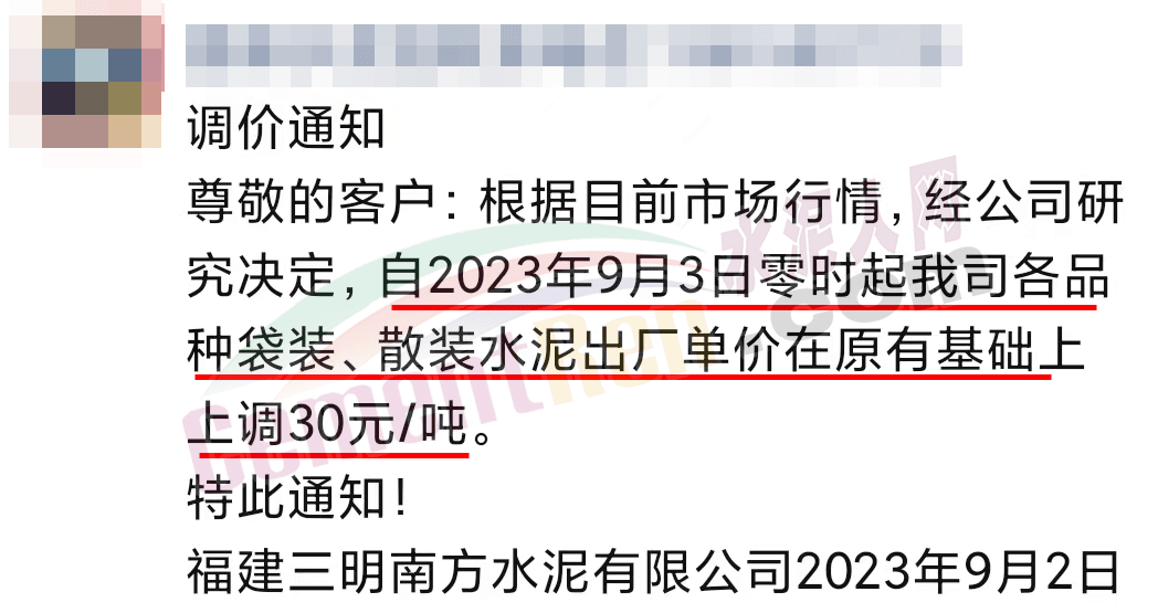 福建水泥股份有限公司通知,根據市場行情,經研究決定自2023年9月3日0時起,公司“建福牌、煉石牌”發往各區域的水泥含稅價格上調30元/噸。